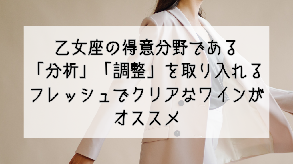 乙女座の良いエネルギーを受け取るために飲みたいのが、「洗練」や「純粋」を表すようなフレッシュでクリアなソーヴィニヨンブラン。産地はお好みで構いませんが、イチオシなのはフランスのサンセール。もし手に入らない場合は日本の甲州やドイツ、フランスのリースリングも良いでしょう。爽やかなミネラル感が心身のバランスを整え、冷静な判断力をサポートしてくれるでしょう。週末にゆっくりと味わってみてはいかがでしょうか。